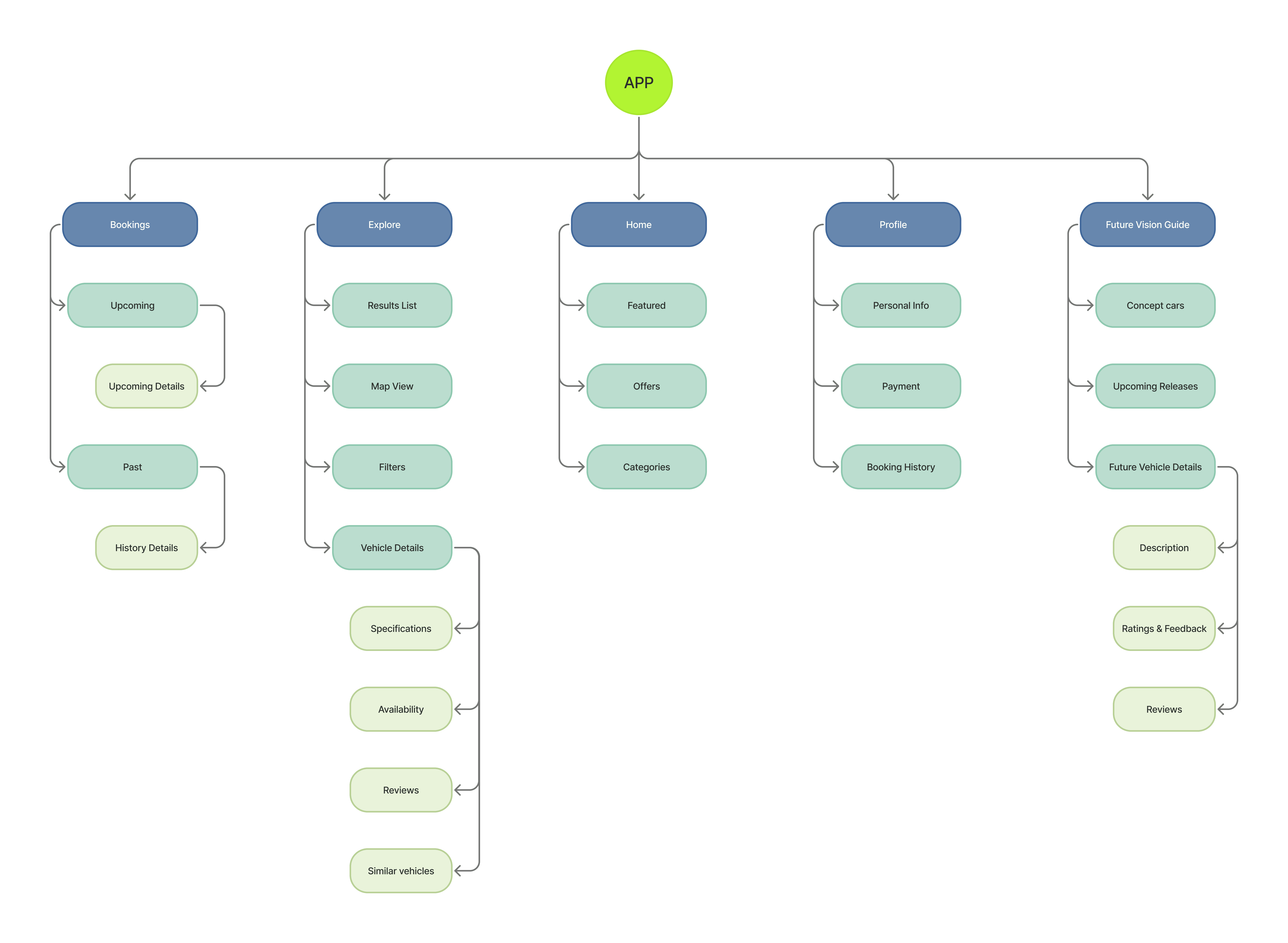 Secondary paths, such as booking management, profile settings, and access to the Future Vision Guide, extend the app’s value beyond the transactional moment.
