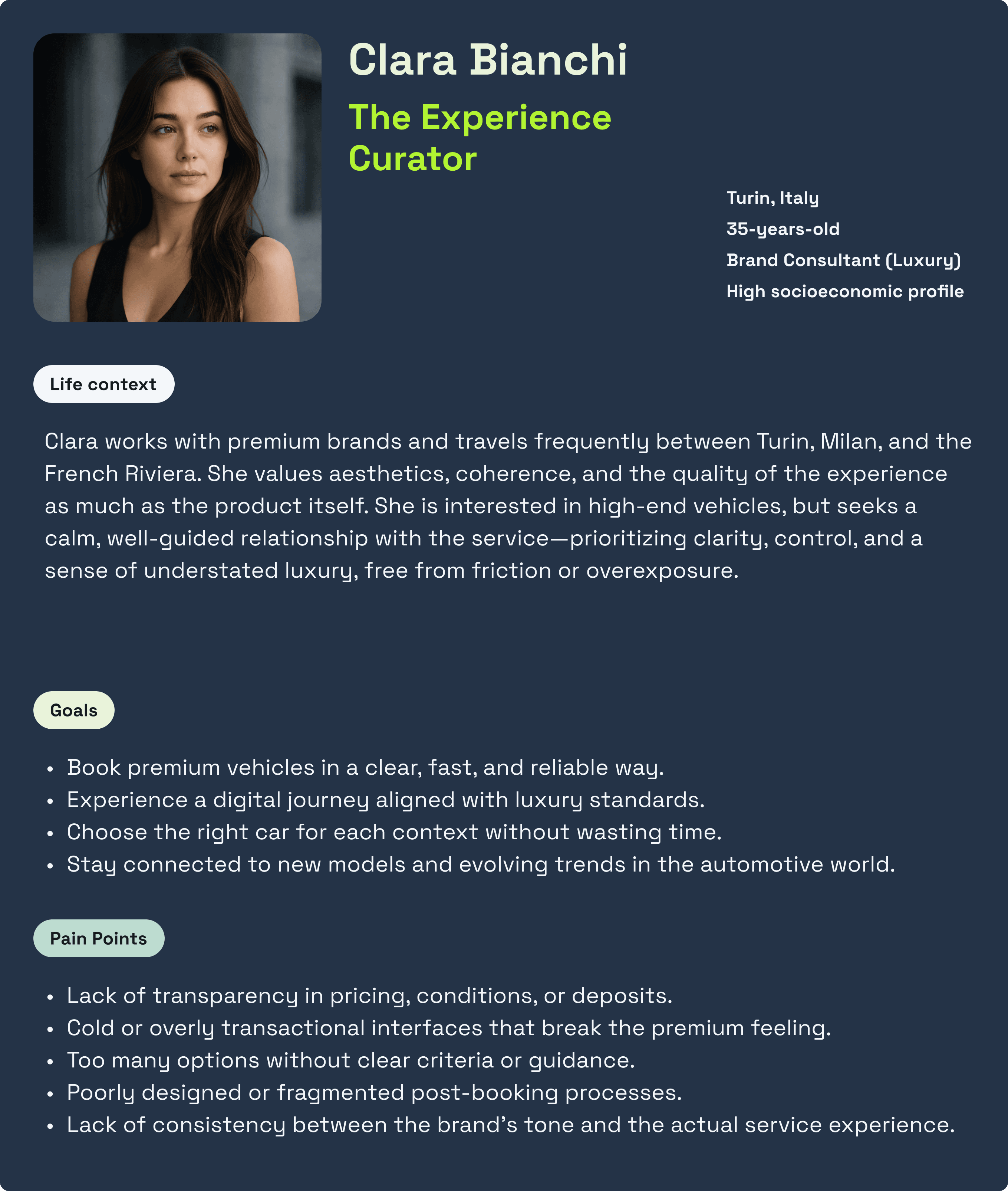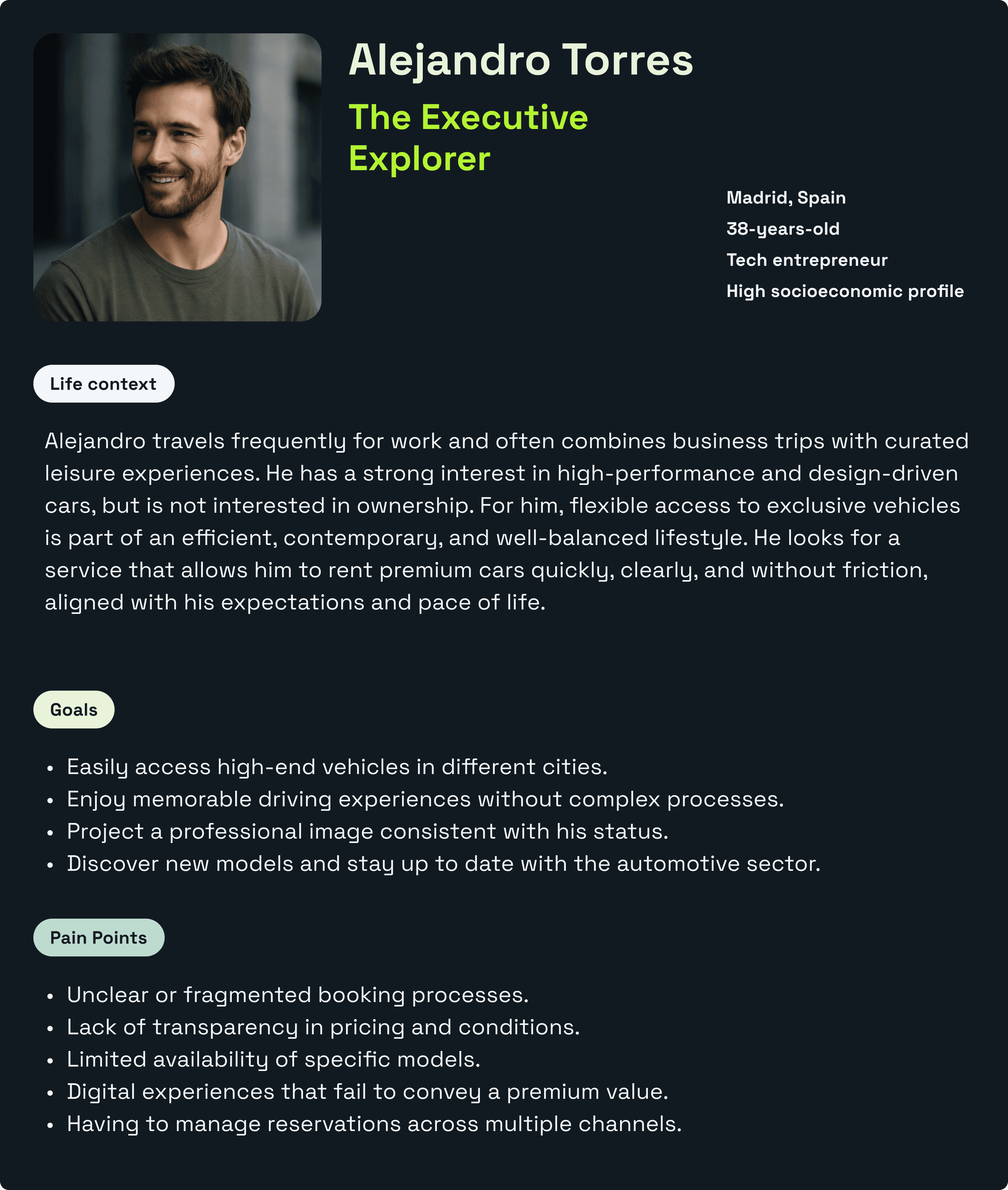 These personas reflect two complementary approaches to premium car rental: performance-driven efficiency and experience-driven refinement.