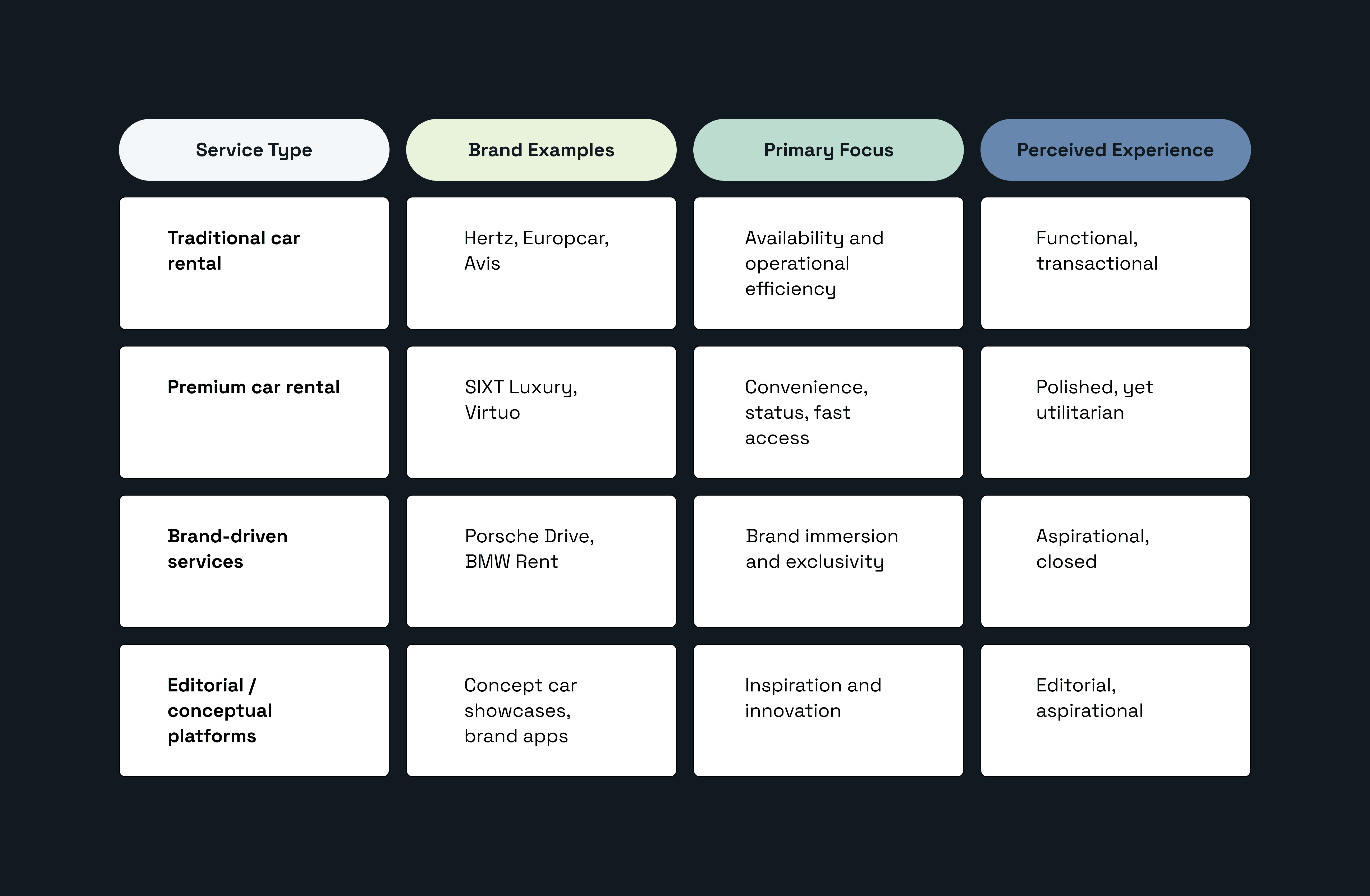 Overview of current service and experience models within the premium car rental market.