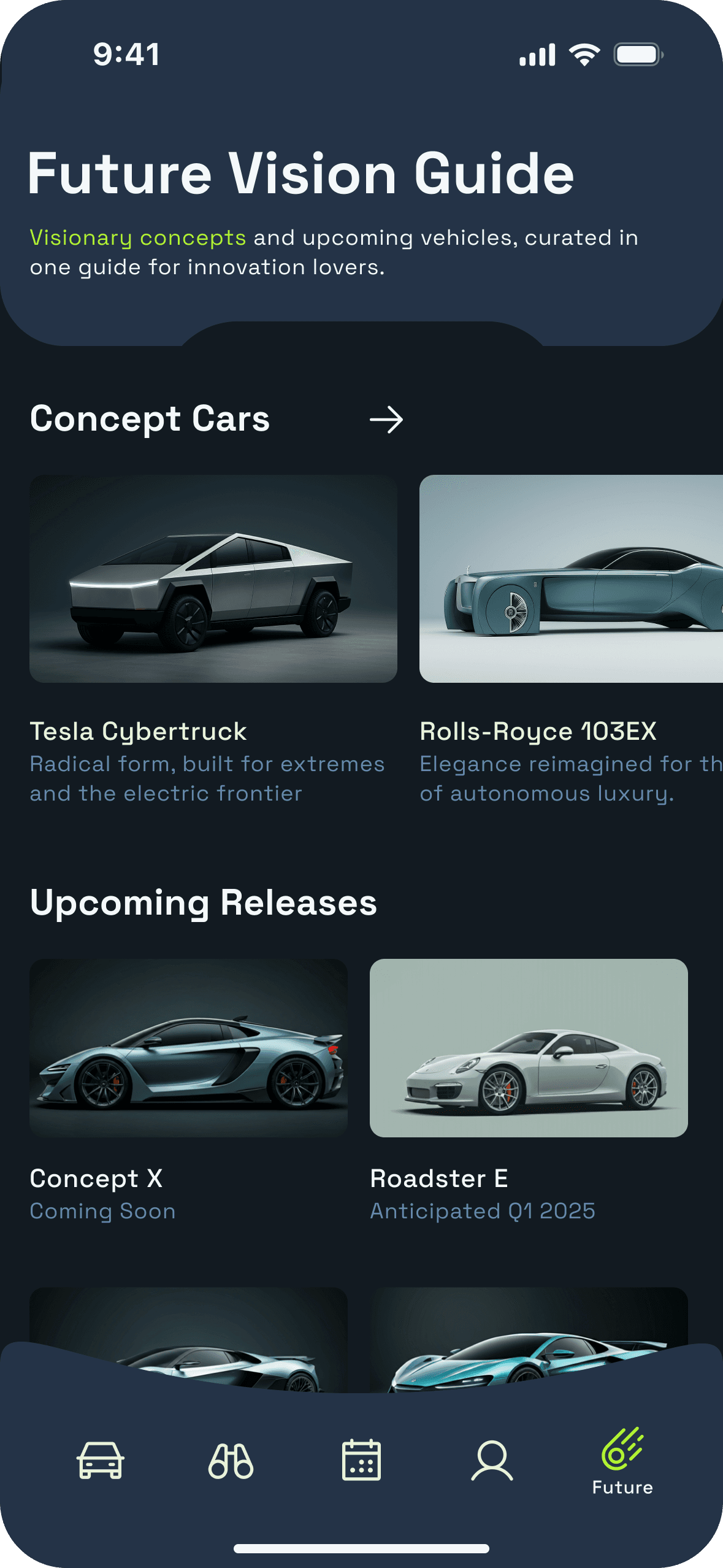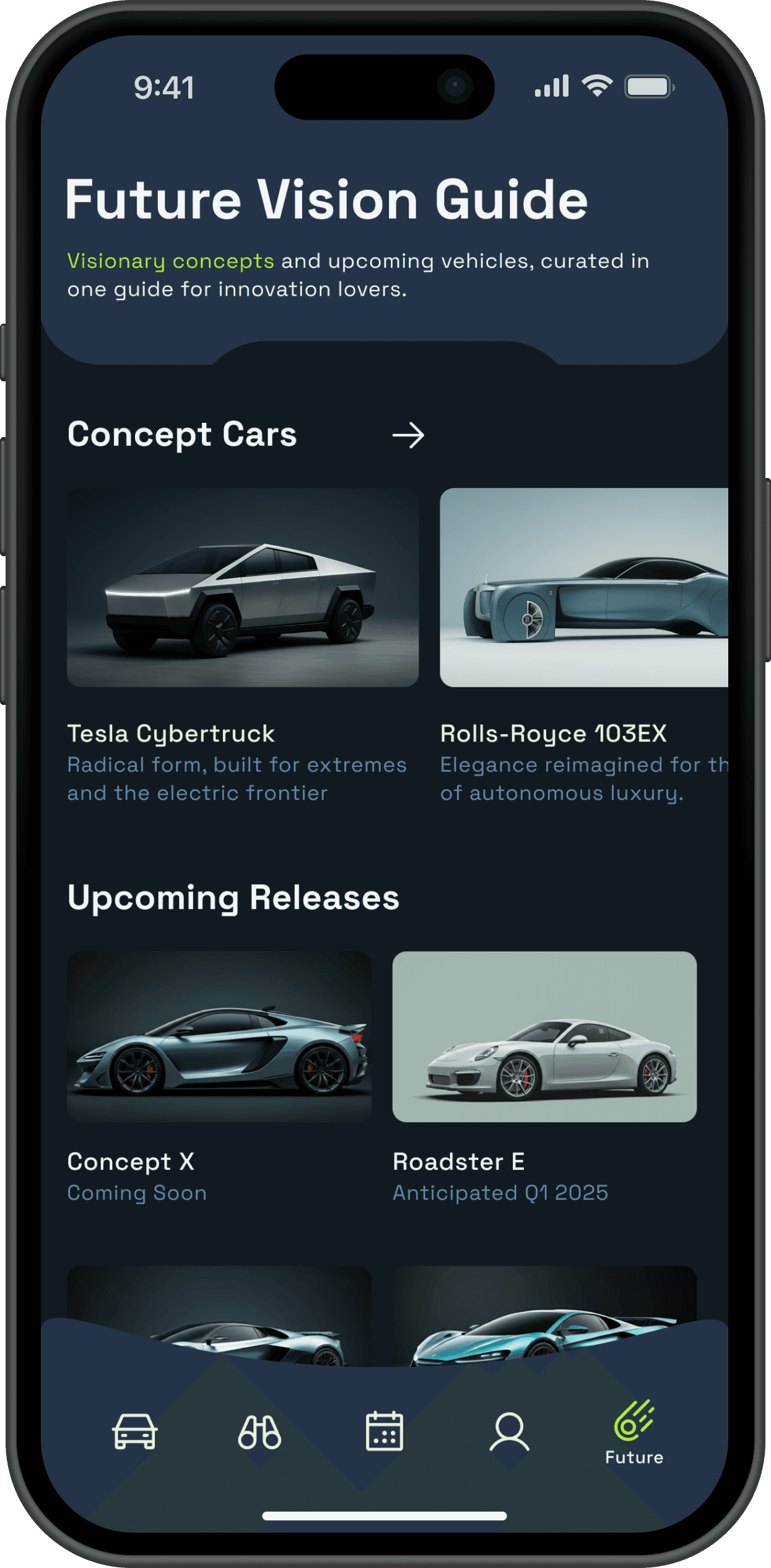 Through Future Vision Guide, the platform is conceived not only as a rental service, but also as a reference space for discovering new models, concepts, and trends within the experience itself.